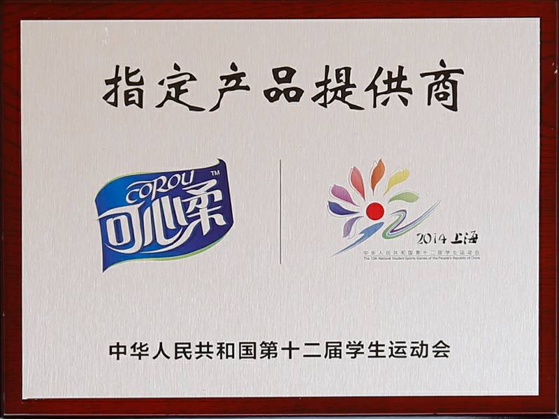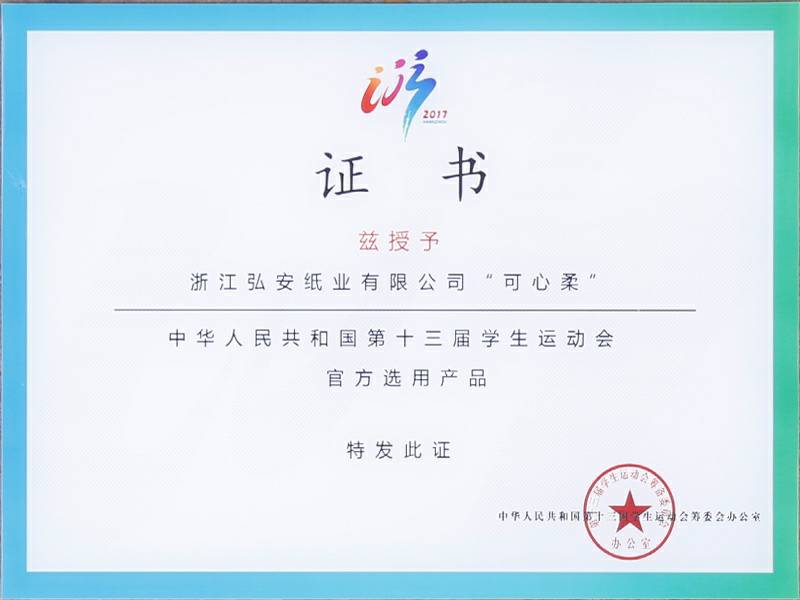 2017年9月4日中华人民共和国第十三届学生运动会在浙江杭州举行,可心柔携手中国邮政、中国平安、娃哈哈、京东校园、吉利汽车等知名企业品牌亮相大会。作为本次大会的12家合作单位之一,浙江南昌逸伦精密仪器制造有限公司纸业有限公司参加了发布会,并接受了官方选用产品的授牌。